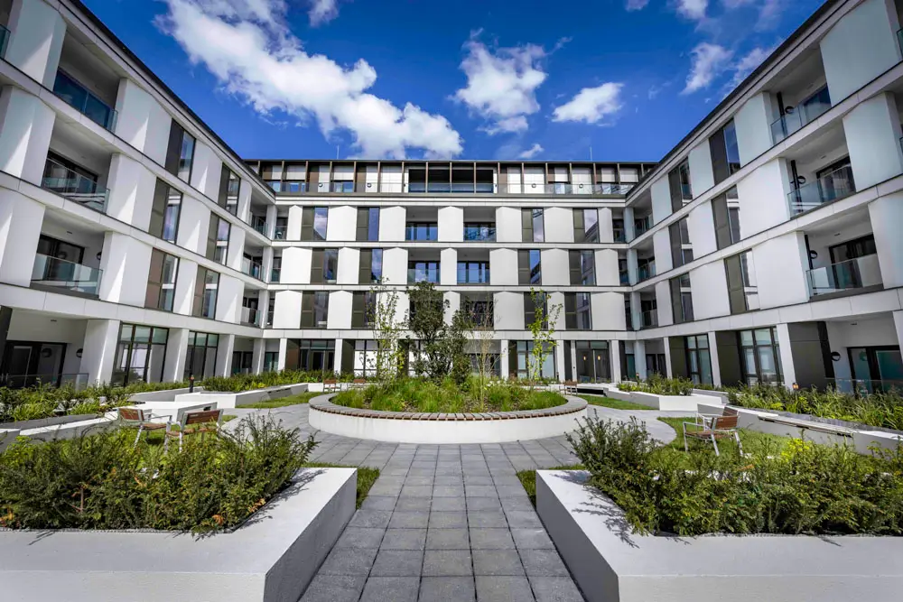 Shortlisted for the Housing Design Awards, the pattern of the façade drew inspiration from the design of the original building, and the architects aimed to create a strong sense of community for future residents. Streets and open spaces are lined with new and existing mature trees, and there are convenient transport links via road, rail and Heathrow Airport. Residents also have access to a range of amenities on their doorstep, including a cinema, golf club and schools.